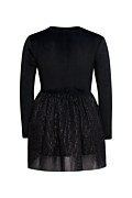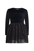 Super soft velour dress for girls. Features scoop neckline, colorful sparkling strass embellishments on the chest, long sleeves and sheer mesh containing shimmering threads. Fully lined. Suitable dress for our girls to have the perfect look every time they wear it! Model wears size 6, height: 1,15cm.