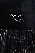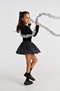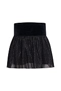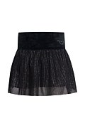 Super soft velour skirt with ruffles for girls. Features sheer mesh containing shimmering threads, a wide elastic waistband for a firm fit adorned with strass embellishments on the side. Fully lined. Suitable skirt for our girls to have the perfect look every time they wear it! Model wears size 8, height: 1,27cm.