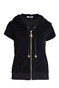 Short-sleeved monochrome terry jacket with patch pockets on the front, double hoodie, adjustable drawstring and gold logo heart puller. Elastic waistband, iconic heart zipper and heart stoppers. Relaxed fit. Combine it with the pants 23811110 for a perfect look.