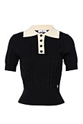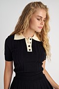 Fitted knit crop top with a contrasting polo collar and short sleeves. Button-up front. Ribbed cuffs and hem. Combine it with the skort 25834061 for a perfect outfit. Model wears size S: Height: 1,79cm, Bust: 84cm, Waist: 60cm, Hips: 90cm.