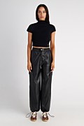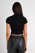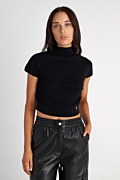 Monochrome knitted top with a high neckline and short sleeves. Features ruched side detailing for a draped effect. Slim fit.