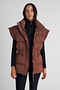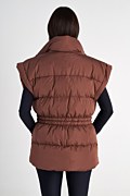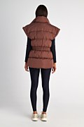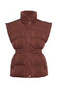 Monochrome puffer vest with quilted stitching. Features a high collar, side pockets, and front closure with zipper and snap buttons. Designed with an elasticated waist for a more fitted silhouette. A sporty yet chic piece, perfect for all-day wear and ideal for layering.