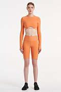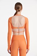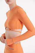 Sports crop top with long sleeves. It has details for the thumbs on the cuffs that give a warm feeling to the hands and a firm fit of the sleeves, a high neckline, an open back and clasp at the back. It is quite elastic and suitable for fitness and not only. The fit is slim and fits perfectly with the biker leggings 22865145 or with any monochrome leggings.