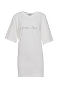 Short sleeved oversized cotton top with a scoop neckline in loose fit. Adorned with strass embellishments on the front. Relaxed, loose fit. Suitable for both casual outfits and special occasions. Model wears size S: Height: 1,78cm, Bust: 88cm, Waist: 63cm, Hips: 91cm.