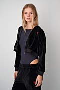 Monochrome cropped velour jacket featuring strass embellishments on the chest, adding a touch of sparkle to your look. Designed with patch pockets at the front, double hoodie and elastic bands in both waist and sleeves. Front zipper closure. Regular fit. Combine it with the pants 24831190 for a complete look. Model wears size S: Height: 1,77cm, Bust: 80cm, Waist: 65cm, Hips: 90cm.