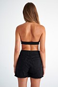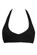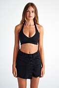 Cropped, sleeveless halterneck rib top in monochrome style. Strass embellishment at the front and open back. Very cropped length. Slim fit.
