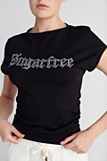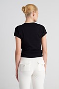 Monochrome cotton t-shirt with strass embellishments on the front. Featuring scoop neckline and gathered side seams that create a gently draped effect. Slim fit. Suitable for wearing from morning to night! Model wears size S: Height: 1,78cm, Bust: 88cm, Waist: 63cm, Hips: 91cm.