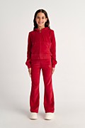 Monochrome velour track set for girls, adorned with colorful strass. Hoodie jacket with sparkling colorful strass embellishment on the back. Features front patch pockets, elastic ribbed bands in both waist and sleeves, and a bold, eye-catching rainbow zipper closure. Pants are fitted through the hips with flared hems. Designed wth an elastic waistband for a firm fit and an iconic heart-shaped patch pocket at the back. Regular fit. This set ensures our girls have the perfect outfit every time they wear it. Whether for casual days, school, or special outings, this velour tracksuit is designed to keep them looking stylish and feeling comfortable all day long. Model wears size 8, height: 1,30cm.