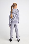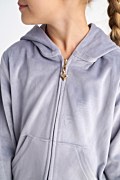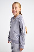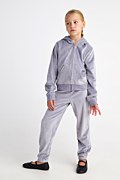 Girls monochrome super soft shiny velour tracksuit set. Hooded jacket in monochrome style. Gold logo heart zipper, elastic bands in both waist and sleeves and patch pockets at the front. Straight leg track pants with elastic cuff hem. Elastic waistband for a firm fit and SF logo at the front side.