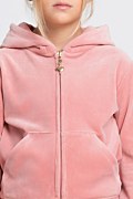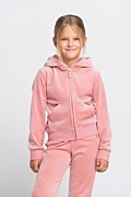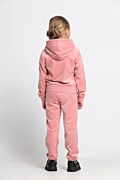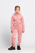 Girls monochrome super soft shiny velour tracksuit set. Hooded jacket in monochrome style. Gold logo heart zipper, elastic bands in both waist and sleeves and patch pockets at the front. Straight leg track pants with elastic cuff hem. Elastic waistband for a firm fit and SF logo at the front side.