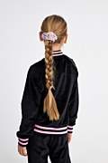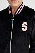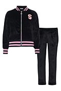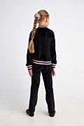 Super soft velour tracksuit set for girls. Jacket with collar and elastic ribbed bands in both waist and sleeves in pink and black stripes for a striking contrast. A decorative letter 'S' on the chest adds a fashionable touch, while the bold, eye-catching rainbow zipper closure completes the look. Pants in straight-leg fit with an elastic waistband for a firm fit and side pockets. Adorned with sparkling heart-shaped strass on one leg, adding a touch of glamour to any outfit. Regular fit. This set ensures our girls have the perfect outfit every time they wear it. Whether for casual days, school, or special outings, this super soft velour tracksuit is designed to keep them looking stylish and feeling comfortable all day long. Model wears size 8, height: 1,30cm.