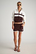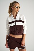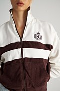 Two-tone jacket with long sleeves, made from a soft-touch modal blend and terry fabric. Features a high collar, embroidered design on the chest, front side pockets and rib banded cuffs in both waist and sleeves. Front zipper closure. Relaxed, loose fit. Combine it with the shorts 25810101 for a standout, coordinated look.