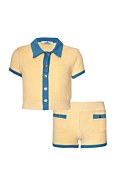 Two-tone terry set for girls. Short-sleeved terry top with collar, 'V' neckline and decorative buttons at the front side. Terry shorts in slim fit with an elasticated waistband for a firm fit and patch pockets with decorative buttons at the front. Short length.