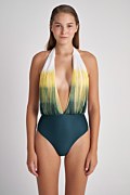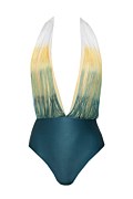 Οnepiece swimsuit with halterneck ties. Allover multicolor printed, decorative fringes at the front side and 'V' plunged. Light padding with removable pads, open back and moderate back coverage.