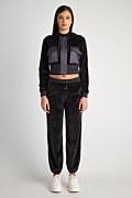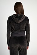 Elevate your wardrobe with this versatile Sugarfree velour piece that seamlessly blends style and comfort! Cropped velour jacket with two patch pockets with flaps on the chest. The addition of a satin fabric patch pockets adds a touch of elegance and contrast to the overall design. Double hoodie, adjustable drawstring, long sleeves and rib banded cuffs in both waist and sleeves. Front zipper closure. Regular fit. Combine it with the pants 24811035 and take off your style! Model wears size S: Height: 1,79cm, Bust: 84cm, Waist: 61cm, Hips: 91cm.
