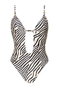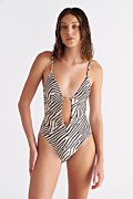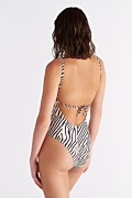 Zebra printed onepiece swimsuit with front cutouts. Features a deep 'V' neckline and light padding with removable pads. Tie closure at the back. Moderate back coverage.