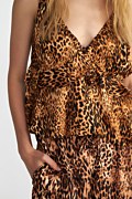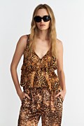 Κοντή μπλούζα με λεοπάρ τύπωμα σε όλο το ύφασμα. Διαθέτει λεπτές ρυθμιζόμενες τιράντες, 'V' λαιμόκοψη και βολάν. Χαλαρή και άνετη εφαρμογή. Συνδύασέ το με το παντελόνι 25807699 και σίγουρα θα εντυπωσιάσεις με το τέλειο look σου. Το μοντέλο φοράει μέγεθος S: Ύψος: 1,76 εκ., Στήθος: 76 εκ., Μέση: 62 εκ., Περιφέρεια: 90 εκ.