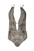Ολόσωμο μαγιό με λαιμόκοψη halter και λεοπάρ τύπωμα σε όλο το ύφασμα. Διαθέτει βαθύ 'V' ντεκολτέ, μικρή ενίσχυση στο στήθος με αφαιρούμενα cups και ανοιχτή πλάτη. Δένει στον λαιμό και στην πλάτη. Κανονική πίσω κάλυψη.