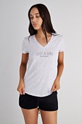 Mονόχρωμη, βαμβακερή κοντομάνικη μπλούζα με 'V' λαιμόκοψη. Διαθέτει αστραφτερά στρας στο μπροστινό μέρος. Κανονική εφαρμογή. Συνδυάζεται με όλα τα casual ρούχα σου για να τη φοράς από το πρωί έως το βράδυ!