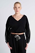 Μονόχρωμη βαμβακερή κοντή μπλούζα. Διαθέτει 'V' λαιμόκοψη, μακριά μανίκια με διακοσμητικό σιρίτι, λάστιχο στους καρπούς, λάστιχο σφηκοφωλία στη μέση και iconic Sugarfree λογότυπο στο πίσω μέρος. Η εφαρμογή της είναι φαρδιά και άνετη. Ιδανική μπλούζα για να τη φοράς από το πρωί έως το βράδυ! Για τέλειο outfit συδύασέ την με το παντελόνι 26811059. Το μοντέλο φοράει μέγεθος S: Ύψος: 1,78 εκ., Στήθος: 88 εκ., Μέση: 63 εκ., Περιφέρεια: 91 εκ.