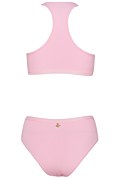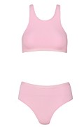 Μονόχρωμο, εφηβικό ριμπ μαγιό μπικίνι σετ. Αποτελείται από crop τοπ με αθλητική πλάτη και μικρή ενίσχυση στο στήθος με αφαιρούμενα pads. Μαγιό μπικίνι σλιπ με κανονική πίσω κάλυψη.