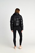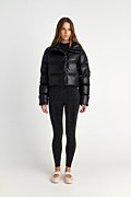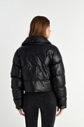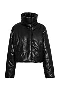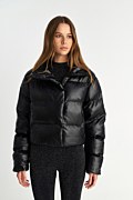 Μακρυμάνικο φουσκωτό μπουφάν με καπιτονέ ύφανση σε δερμάτινη υφή. Διαθέτει όρθιο γιακά και τσέπες με φερμουάρ στο μπροστινό μέρος. Κλείσιμο μπροστά με μεταλλικό φερμουάρ και κρυφά κουμπιά. Φοδραρισμένο. Κανονική εφαρμογή.