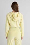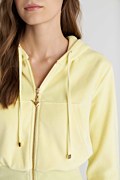 Μονόχρωμη κοντή βελουτέ ζακέτα με φαρδύ λάστιχο στη μέση. Διαθέτει κουκούλα με ρυθμιζόμενο κορδόνι, μπροστινές καγκουρό τσέπες και ανοιγόμενο φερμουάρ με επιχρυσωμένο λογότυπο. Η εφαρμογή της είναι άνετη και αν θες τέλειο στυλ συνδύασέ την με το παντελόνι 26811073. Το μοντέλο φοράει μέγεθος S: Ύψος: 1,78 εκ., Στήθος: 88 εκ., Μέση: 63 εκ., Περιφέρεια: 91 εκ.