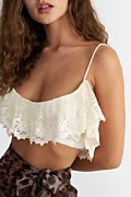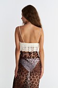 Ημιδιάφανη κοντή μπλούζα/μπουστάκι με δαντέλα. Διαθέτει αεράτο ύφασμα με διάτρητο, τρυπητό κέντημα, στρογγυλή λαιμόκοψη, λεπτές τιράντες και λεπτομέρεια με διακοσμητικά βολάν μπροστά και πίσω. Κανονική εφαρμογή. Πολύ κοντό σε μήκος. Το μοντέλο φοράει μέγεθος S: Ύψος: 1,73 εκ., Στήθος: 81 εκ., Μέση: 60 εκ., Περιφέρεια: 89 εκ.