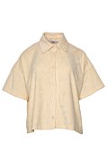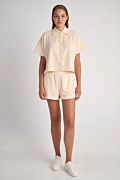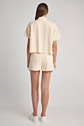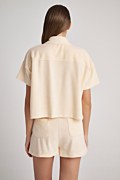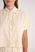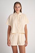 Πετσετέ μονόχρωμη κοντή μπλούζα σε στυλ πουκαμίσου σε φαρδιά γραμμή. Διαθέτει κοντά, φαρδιά μανίκια, γιακά και κλείσιμο στο μπροστινό μέρος με κουμπιά. Για τέλειο outfit συνδύασέ την με το σορτς 24810097. Ιδανικό τοπ για στυλ και άνεση από το πρωί έως το βράδυ! Το μοντέλο φοράει μέγεθος S/M: Ύψος: 1,81 εκ., Στήθος: 88 εκ., Μέση: 62 εκ., Περιφέρεια: 91 εκ.