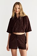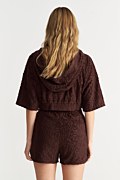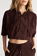 Μονόχρωμη κοντή πετσετέ ζακέτα με ανάγλυφα σχέδια. Διαθέτει κουκούλα με ρυθμιζόμενο κορδόνι, φαρδιά μανίκια 3/4, μπροστινές καγκουρό τσέπες, ανοιγόμενο φερμουάρ και λάστιχο στη μέση. Κανονική εφαρμογή. Για τέλειο στυλ, συνδύασέ την με το σορτς 25810090 ή με το παντελόνι 25811090. Το μοντέλο φοράει μέγεθος S: Ύψος: 1,76 εκ., Στήθος: 76 εκ., Μέση: 62 εκ., Περιφέρεια: 90 εκ.