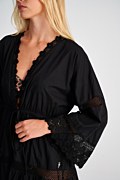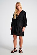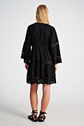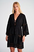 Κοντό φόρεμα/καφτάνι παραλίας από αεράτο ύφασμα με τρυπητό κέντημα. Διαθέτει 'V' λαιμόκοψη και φαρδΙά μανίκια 3/4. Κλείσιμο μπροστά με λεπτά δετά κορδόνια. Χωρίς φόδρα. Χαλαρή εφαρμογή. Το μοντέλο φοράει μέγεθος S/M: Ύψος: 1,75 εκ., Στήθος: 84 εκ., Μέση: 62 εκ., Περιφέρεια: 90 εκ.