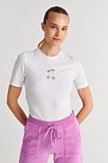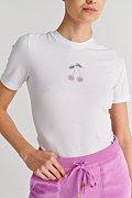 Κοντομάνικη, βαμβακερή μπλούζα με στρογγυλή λαιμόκοψη, διακοσμημένη με πολύχρωμα στρας στο μπροστινό μέρος, με σχέδιο κεράσια. Κανονική εφαρμογή. Φοριέται από το πρωί έως το βράδυ! Το μοντέλο φοράει μέγεθος S: Ύψος: 1,75 εκ., Στήθος: 80 εκ., Μέση: 60 εκ., Περιφέρεια: 90 εκ.