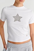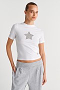 Αναβάθμισε την γκαρνταρόμπα σου με αυτή την κοντομάνικη βαμβακερή μπλούζα, διακοσμημένη με στρας στο μπροστινό μέρος με σχέδιο αστέρι. Διαθέτει στρογγυλή λαιμόκοψη. Κανονική εφαρμογή. Φοριέται από το πρωί έως το βράδυ! Το μοντέλο φοράει μέγεθος S: Ύψος: 1,75 εκ., Στήθος: 80 εκ., Μέση: 60 εκ., Περιφέρεια: 90 εκ.