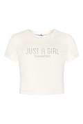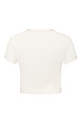 Εφηβική βαμβακερή κοντομάνικη μπλούζα με στρας στο μπροστινό μέρος. Διαθέτει στρογγυλή λαιμόκοψη και η γραμμή της είναι στενή.
