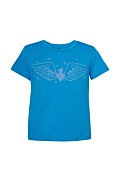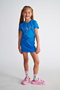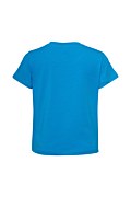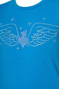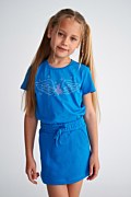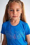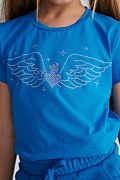 Παιδική, βαμβακερή, κοντομάνικη μπλούζα με πολύχρωμα στρας στο μπροστινό μέρος. Διαθέτει στρογγυλή λαιμόκοψη και η γραμμή της είναι κανονική.
