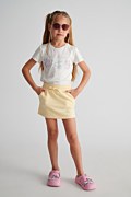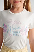 Παιδική, βαμβακερή, κοντομάνικη μπλούζα με πολύχρωμα στρας στο μπροστινό μέρος. Διαθέτει στρογγυλή λαιμόκοψη και η γραμμή της είναι κανονική.