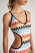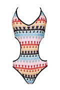 Ολόσωμο κροσέ μαγιό με πολύχρωμο επαναλαμβανόμενο μοτίβο σε όλο το ύφασμα. Διαθέτει 'V' ντεκολτέ, μικρή ενίσχυση στο στήθος με αφαιρούμενα pads, λεπτές ρυθμιζόμενες τιράντες και ανοίγματα στο πλάι. Δένει στην πλάτη. Φοδραρισμένο ύφασμα. Κανονική πίσω κάλυψη.
