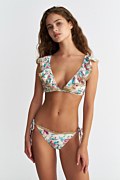 Xαμηλόμεσο μπικίνι σλιπ με φλοράλ τύπωμα σε όλο το ύφασμα. Δένει με κορδονάκια στα πλάγια. Κανονική πίσω κάλυψη. Για ένα πιο ολοκληρωμένο look συνδύασέ το με το αντίστοιχο μπικίνι τοπ 25801391.