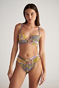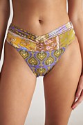 Ψηλόμεσο μαγιό μπικίνι σλιπ με πολύχρωμο τύπωμα σε όλο το ύφασμα. Διαθέτει μπροστινή ντραπέ λεπτομέρεια. Κανονική πίσω κάλυψη.