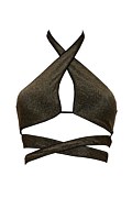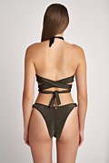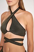 Mαγιό μπικίνι τοπ με γυαλιστερές μπρονζέ λεπτομέρειες σε όλο το ύφασμα που προσθέτουν μια πινελιά πολυτέλειας και γοητείας. Δένει στο λαιμό και στην μέση. Διαθέτει μικρή ενίσχυση στο στήθος με αφαιρούμενα pads και μακριά κορδόνια στο πίσω μέρος, τα οποία δένουν χιαστί μπροστά. Συνδύασε αυτό το εκπληκτικό τοπ με το ασορτί μπικίνι σλιπ 24802340 για μια ολοκληρωμένη εμφάνιση.