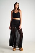 Ξεχώρισε με αυτή την εντυπωσιακή, μονόχρωμη μακριά φούστα. Διαθέτει ελαστική μέση με σούρες που κολακεύει και αναδεικνύει τη σιλουέτα, ενώ το ημιδιάφανο τελείωμα από τούλι χαρίζει ανάλαφρη κίνηση. Ιδανική για καλοκαιρινές εμφανίσεις με στυλ. Συνδύασέ τη με την κοντή μπλούζα 25806255 για μια μοντέρνα καλοκαιρινή εμφάνιση. Το μοντέλο φοράει μέγεθος S: Ύψος: 1,79 εκ., Στήθος: 81 εκ., Μέση: 61 εκ., Περιφέρεια: 90 εκ.