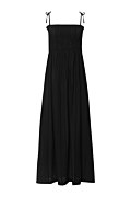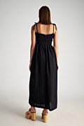 Μονόχρωμο μακρύ φόρεμα από αεράτο βαμβακερό ύφασμα με διάτρητο κέντημα. Διαθέτει τιράντες που δένουν με λεπτομέρεια φιόγκου.