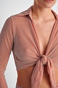 Μονόχρωμη, κοντή μπλούζα με glitter λεπτομέρειες σε όλο το μέρος της. Διαθέτει μακριά μανίκια, γιακά και 'V' ντεκολτέ. Δένει με κόμπο μπροστά. Συνδυάζεται τέλεια με την κοντή φούστα 23805072.