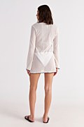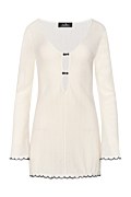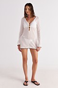 Ημιδιάφανo κοντό φόρεμα/καφτάνι σε στενή γραμμή με ανάλαφρη, κροσέ υφή και τρυπητή πλέξη σε όλο το ύφασμα. Ξεχωρίζει με το βαθύ 'V' ντεκολτέ τις μεταλλικές διακριτικές λεπτομέρειες με ανοίγματα στο στήθος και τα μακριά μανίκια. Ιδανικό ρούχο για τις καλοκαιρινές σου εμφανίσεις, για να το φοράς από το πρωί έως το βράδυ!