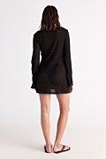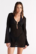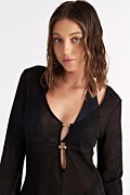 Ημιδιάφανo κοντό φόρεμα/καφτάνι σε στενή γραμμή με ανάλαφρη, κροσέ υφή και τρυπητή πλέξη σε όλο το ύφασμα. Ξεχωρίζει με το βαθύ 'V' ντεκολτέ τις μεταλλικές διακριτικές λεπτομέρειες με ανοίγματα στο στήθος και τα μακριά μανίκια. Ιδανικό ρούχο για τις καλοκαιρινές σου εμφανίσεις, για να το φοράς από το πρωί έως το βράδυ!