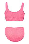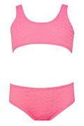 Παιδικό μονόχρωμο σετ μαγιό με ανάγλυφη υφή σε όλο το ύφασμα. Μπικίνι τοπ χωρίς κούμπωμα και σλιπ με μεγάλη πίσω κάλυψη.