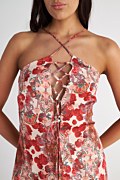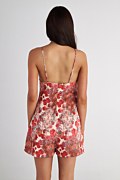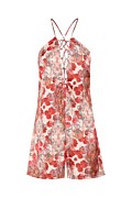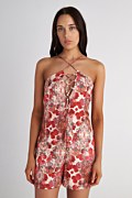 Ολόσωμη κοντή σατέν φόρμα με φλοράλ τύπωμα σε όλο το ύφασμα. Διαθέτει άνοιγμα στο στήθος με κορδόνι από το ίδιο ύφασμα που δένει μπροστά σε φιόγκο και λεπτές, χιαστί, ρυθμιζόμενες τιράντες στην πλάτη. Κλείσιμο στο πίσω μέρος με αόρατο φερμουάρ. Χαλαρή, άνετη εφαρμογή. Ιδανικό καλοκαιρινό ρούχο για όλες τις ώρες της ημέρας. Το μοντέλο φοράει μέγεθος S: Ύψος: 1,79 εκ., Στήθος: 80 εκ., Μέση: 62 εκ., Περιφέρεια: 92 εκ.