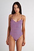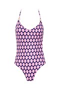 Ολόσωμο μαγιό με μοτίβο ρόμβων σε όλο το ύφασμα. Διαθέτει μικρή ενίσχυση στο στήθος με αφαιρούμενα pads, 'V' ντεκολτέ, διακοσμητικούς κρίκους και λεπτές χιαστί τιράντες. Δένει στην πλάτη. Κανονική πίσω κάλυψη.
