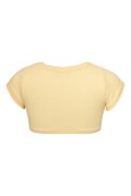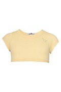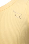 Μονόχρωμη παιδική κοντή μπλούζα από ριμπ ύφασμα, διακοσμημένη με αστραφτερά στρας σε σχήμα καρδιά, στο μπροστινό μέρος. Διαθέτει στρογγυλή λαιμόκοψη και κοντά μανίκια. Στενή εφαρμογή. Πολύ κοντή σε μήκος.