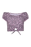Παιδική κοντομάνικη μπλούζα/μαγιό μπικίνι τοπ με ροζ λεοπάρ τύπωμα σε όλο το ύφασμα. Διαθέτει στρογγυλή λαιμόκοψη, φουσκωτά κοντά μανίκια και διακοσμητικό κόμπο στο μπροστινό μέρος από το ίδιο ύφασμα. Συνδυάζεται ιδανικά με τη φούστα 25617045, προσφέροντας στα κορίτσια μας το απόλυτο καλοκαιρινό look κάθε φορά που τη φοράνε!
